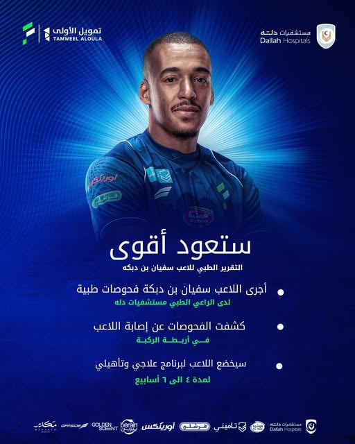 أعلن نادي الفتح الناشط في دوري روشن السعودي إصابة الدولي الجزائري سفيان بن دبكة بتمزق في أربطة الركبة، ليتقرر خضوعه لبرنامج علاجي وتأهيلي يمتد من 4 إلى 6 أسابيع، ما يشكل ضربة قوية للفريق في مشواره بمنافسات الدوري.